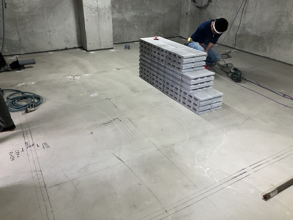 墨出しに沿ってアンカーを打ち、コンクリートブロックを積み
