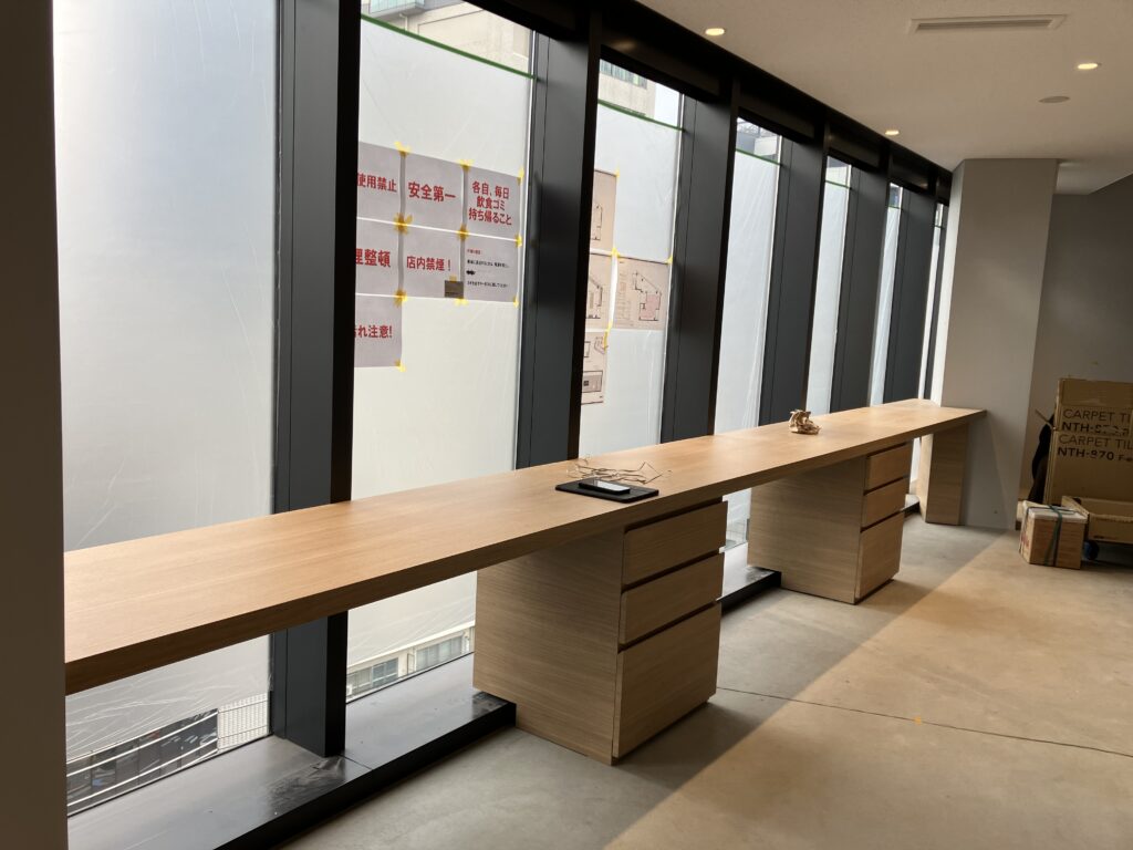 大開口のガラス面に沿ってカウンターデスクがあり、