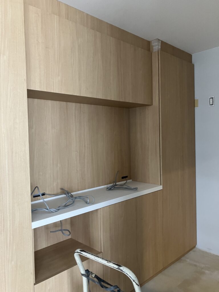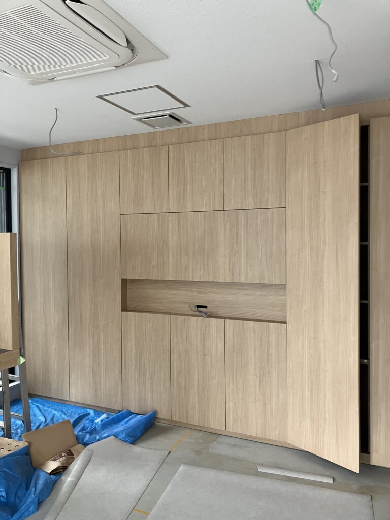 壁面には天井まで伸びた木目のキャビネットになっており、